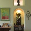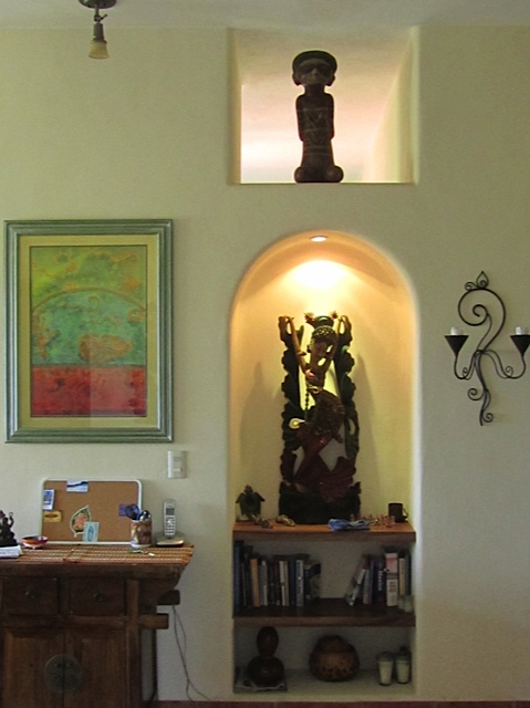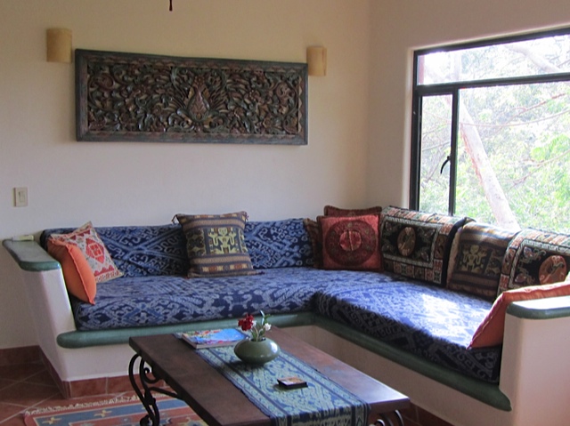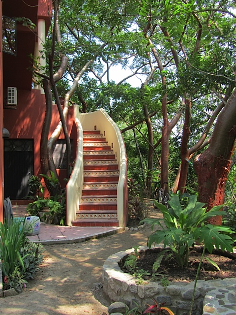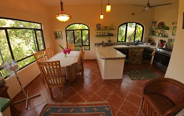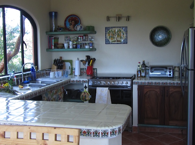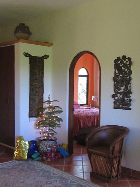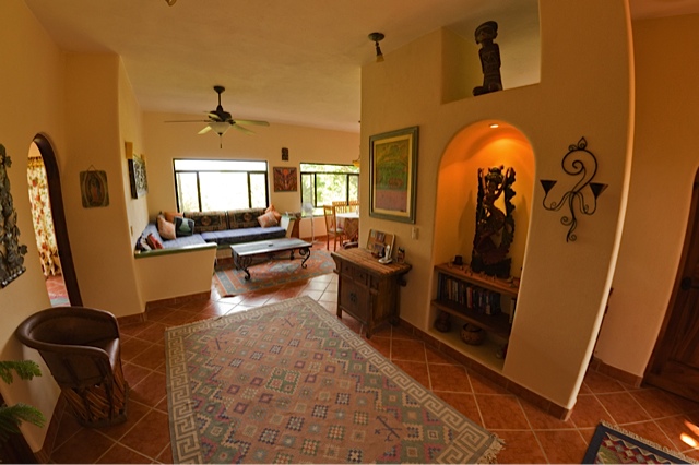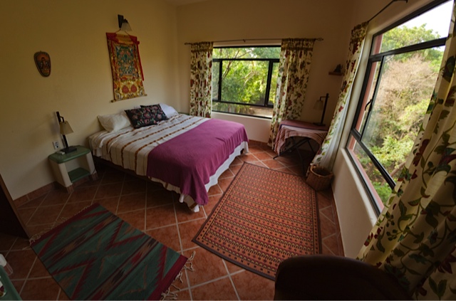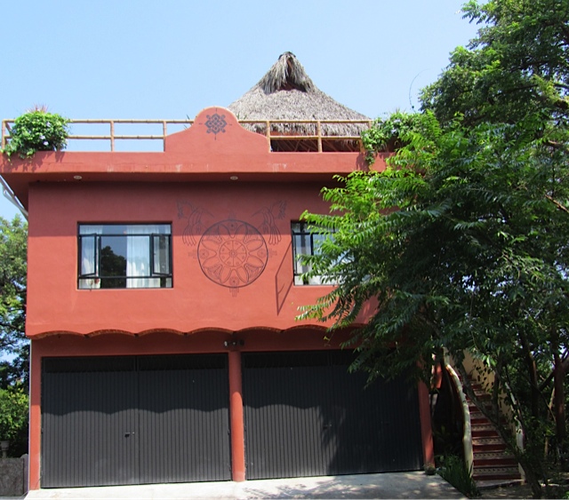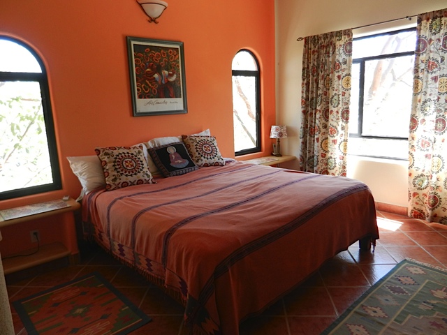 This very comfortable two bedroom second story home is very new and modern with a sampling of traditional Mexican design. The use of arched windows and doors, well lit "niches" offset beautiful statuary, local tiles and colors give this home an old world charm and comfort. While outside, the jungle beauty, singing birds, large Papelillo trees, and distant mountains give the feeling of being in nature. This home provides two air conditioned bedrooms with very comfortable king size beds, ample storage and screened windows. A large living room, dining room and kitchen with modern appliances provide the creature comforts along with the brightly tiled and pollido bathroom.