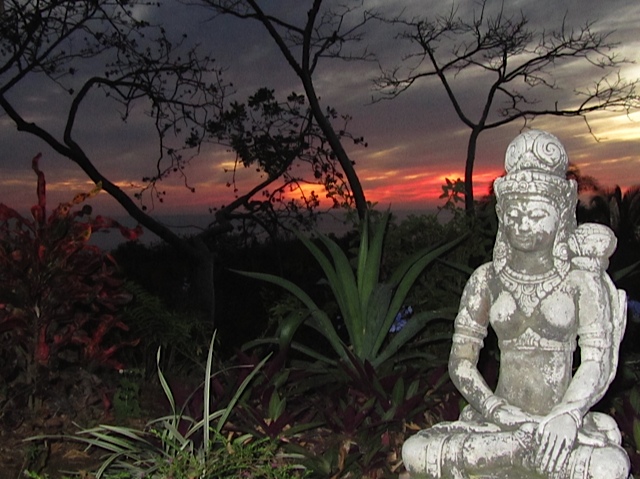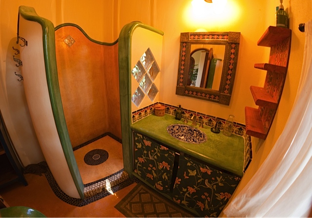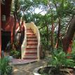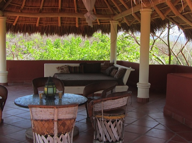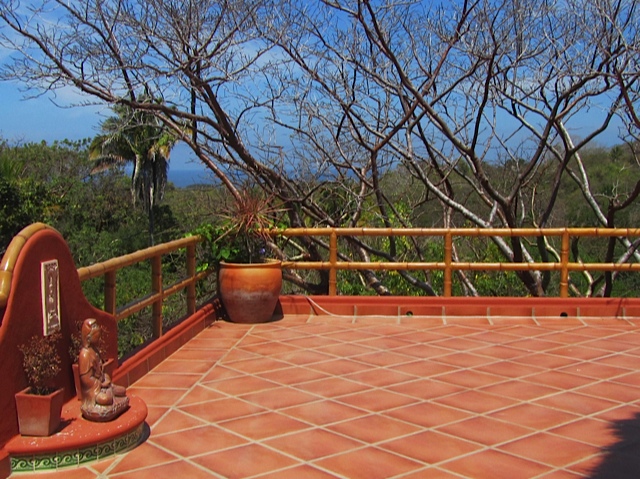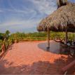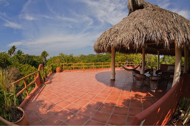 Above is the rooftop viewing deck with a large palapa roof to provide shade, a kingsize Bali bed with mosquito netting which can serve as a third outdoor bedroom, a hammock for relaxing, and deck chairs for sunbathing. This is a great spot for yoga, Pilates, massage, evening cocktails, morning coffee, bird watching, dinner, music or whatever gathering you may enjoy. Sunrise, sunset, moonrise, moon set, star gazing, or just looking over the jungle toward the distant ocean view. This is a great spot to spend time and unwind.